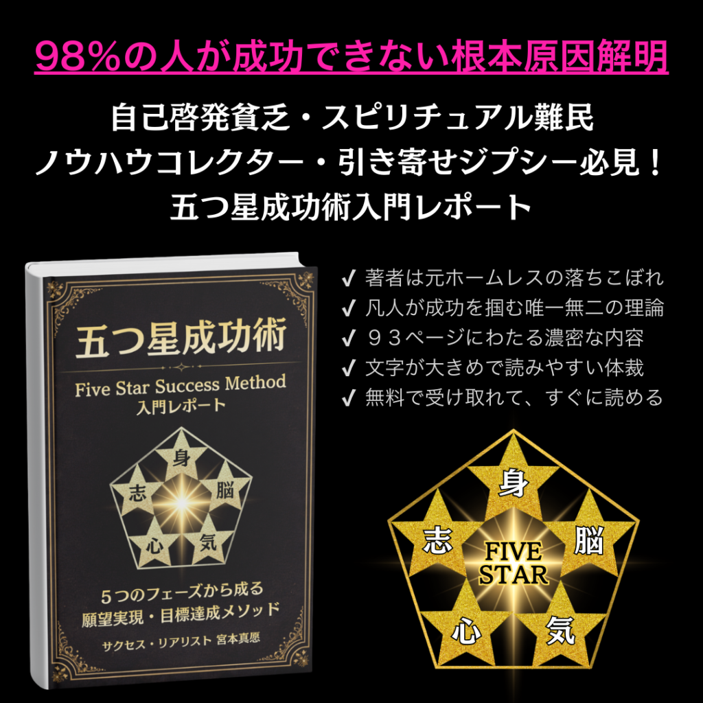 また本業のかたわら、ライフワークの一環として、自身がこれまでに学び実践してきた、古今東西のありとあらゆる成功法則、自己啓発、能力開発、心理学、個性学、脳科学、東洋医学、量子力学、宗教、スピリチュアルをバックボーンにした、凡人の凡人による凡人のための願望実現・目標達成メソッド「五つ星成功術」を発信している。