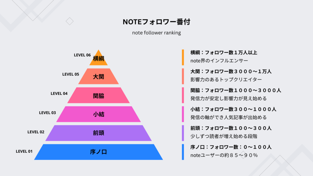 補足:noteでは、情報発信を行わない「読む専門アカウント」や「登録だけして稼働していないアカウント」も多いため、LEVEL01(序ノ口)のゾーンに属しているアカウントが圧倒的多数(85〜90%)です。